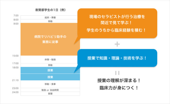 夜間部学生は、1日をどんなスケジュールで過ごしているのでしょうか。下記は夜間部学生の実際の平日1日のスケジュール例です。